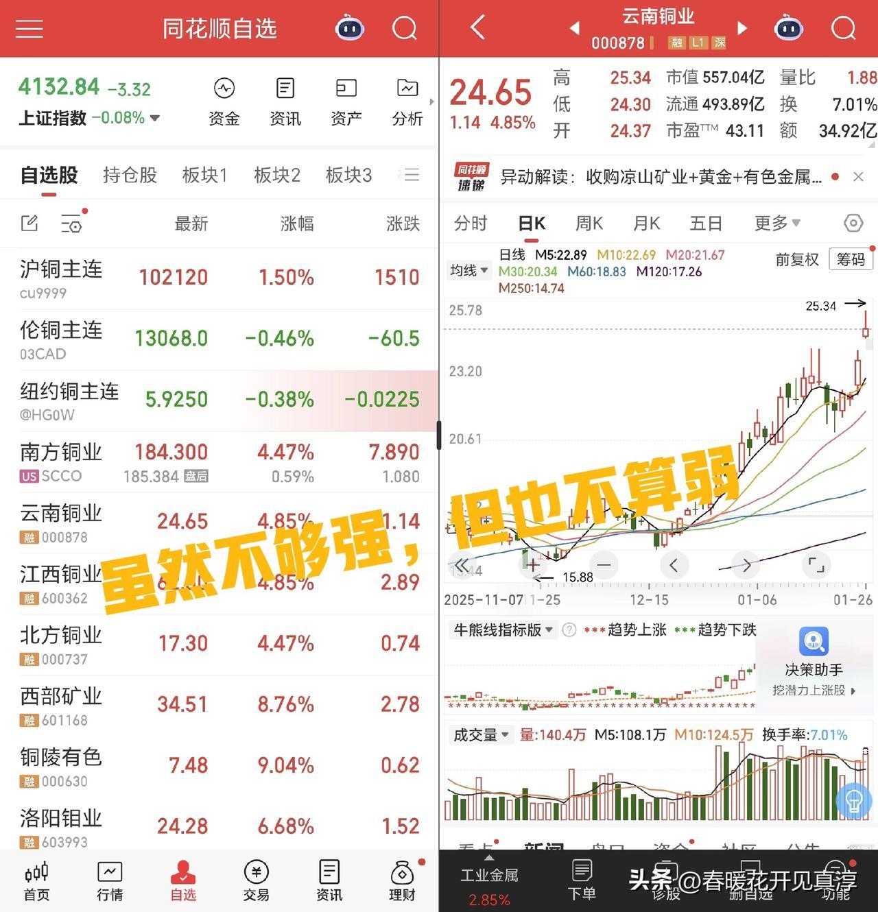 今天,伦敦金正式突破5000美元关口,我们从此进入到了一个新的时代。借这个机会聊一下有色大周期股票的投资和经验教训。 这次黄金突破整数关口,天花板已经被打破,所以黄金股,白银股,锌业股等等都在放量上涨。和铜有关的股票看起来相对弱了一点,但是整体仍然是比较强的。 山东黄金、中金黄金、湖南黄金、赤峰黄金等等一系列黄金股,还有盛达资源等白银股,以及厦门钨业,锌业股份,锡业股份,这些有色品种已经进入到了比较热的上涨阶段。 我们知道铜矿的冶炼,黄金、白银、硫酸等是伴生品,此外,就是虽然英伟达的报告对铜的需求量从多少万吨变成了200吨,听起来是闹了一个乌龙,但是可以确定性的讲铜的未来将和黄金现在的走势一样超乎绝大多数人的预期,这就是在置顶帖里边聊到的,一个20年的大周期,不会轻易结束,并且一定要掀起一个大浪。 所以,持有江西铜业,云南铜业,西部矿业等和铜强相关的股票的朋友,目前需要的就是耐心。想当年,我曾经想在盛达资源上实现最近发生的这种上涨目标,结果那一次亏了很多钱。也就是说事情的发生和我当年做的布局之间,在时间上差了好几年,并且当时的趋势并不是上涨,而是下跌,当年看到了上涨的确定性,但是忽略了时机的重要性。 教训惨烈,应当引以为戒。 那么,在黄金白银这种上涨的状态下,相关股票是否还有买入的价值呢?个人认为,有持有价值,没有买入价值。 有买入价值的是铜、铝等还在周期的低位的品种。比如今天的南山铝业涨的就还可以。 周期股是强波动的品种,在这种投资品上面,绝大多数人是挣不到钱的,或者说绝大多数人是注定要在上面亏钱的。 之前说化工股的机会的时候,很多人不以为然,那现在化工股涨起来,是不是化工股的机会就来了呢?好像也不一定。 如果说煤炭股现在是有投资机会的,大家会不会觉得这是开玩笑? 真正的投资就是要在周期波动的低位买入,而不是在泡沫期买入。在泡沫期买入是高手的操作,因为买了之后你要随时保护自己的仓位。如果你没有能力去保护自己的仓位,那大概率就是接盘侠和韭菜。 伦敦金 有色金属周期