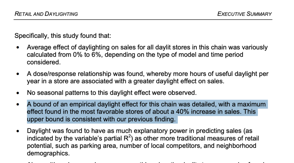 如果这套研究的说辞有点抽象,还有一些非常具体的数据能够体现商业领域亲近自然的效力,比如美国一项研究指出,如果一个普通门店的销售额是2.00美元/平方英尺,那么加入天窗系统后,预测销售额将提升至2.61到2.98美元/平方英尺。