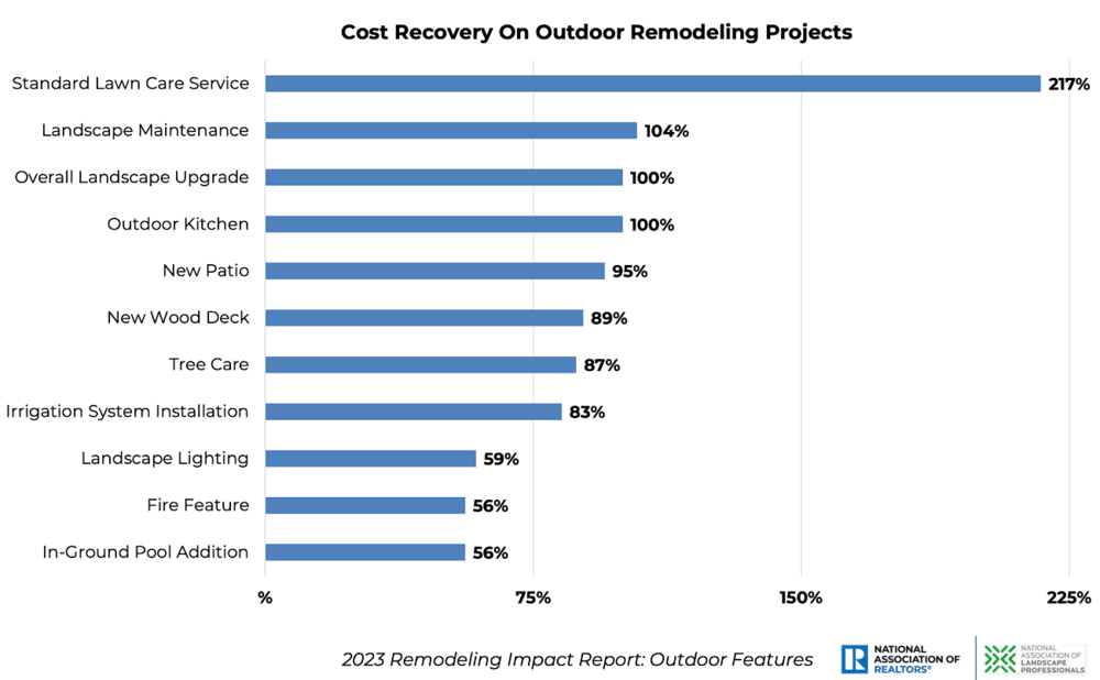 除了草坪之外,该报告还展示了景观维护、景观升级、户外厨房、露台、木质平台、树木护理、户外灯光以及火炉和地下泳池对房屋价值的影响,房屋的户外生活方式场域布置的越完善,在市场上也就越受关注。