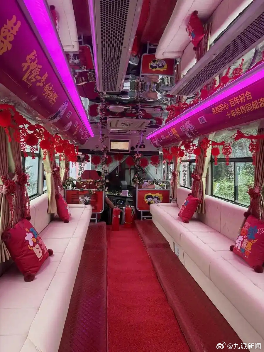 #公交公司推出1314元大巴婚车#【#公交公司回应推出大巴婚车#:1314元一天,载客量大更热闹】近日,一辆新能源“大巴婚车”出现在河北张家口街头,车头以鲜花点缀,车身呈喜庆的红色,“我们结婚啦”五个金色大字格外醒目。车辆由张家口京西公共交通有限公司推出。1月26日,相关工作人员告诉,“大巴婚车”于去年9月底投入运营,目前仅有一辆,定价为每天1314元,寓意“一生一世”。据其介绍,车内经过专门设计,过道铺有红毯,21个座椅包裹红色真皮并绣有龙凤图案,另设有两排真皮沙发,能坐下十多人。灯光采用彩色LED灯带,车内贴有“永结同心”“百年好合”等祝福语。新人可以按喜好添加装饰,也可以在车身外张贴婚纱照。车后窗配有LED大屏,在婚车行驶过程中可对外展示新人的录像和婚纱照。工作人员表示,与传统的婚车车队相比,“大巴婚车”首先在经济上较为实惠,租一辆传统婚车价格为280元左右,车队一般6辆车起步,且头车租赁价格更高;其次,“大巴婚车”与传统婚车不同,符合年轻人追求个性的需求;同时,大巴载客量大,亲朋好友可以同车聊天、互动,气氛更热闹。其回忆,“大巴婚车”首次使用是在去年“七夕节”市政府组织的集体婚礼,当时为免费使用,公司职工的孩子结婚时也曾使用,反响较好。其称,近期已有两对新人预订了“大巴婚车”。