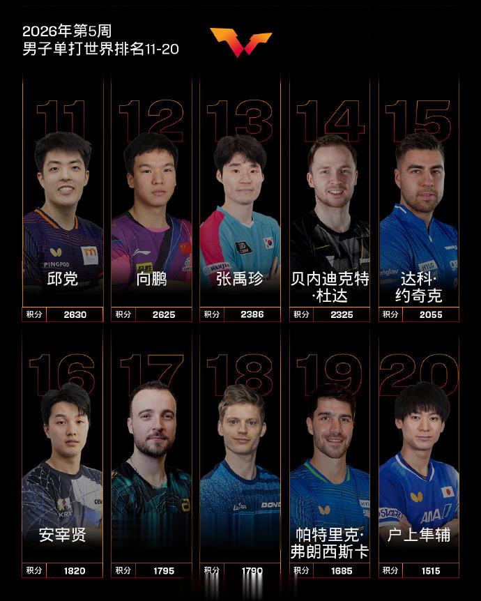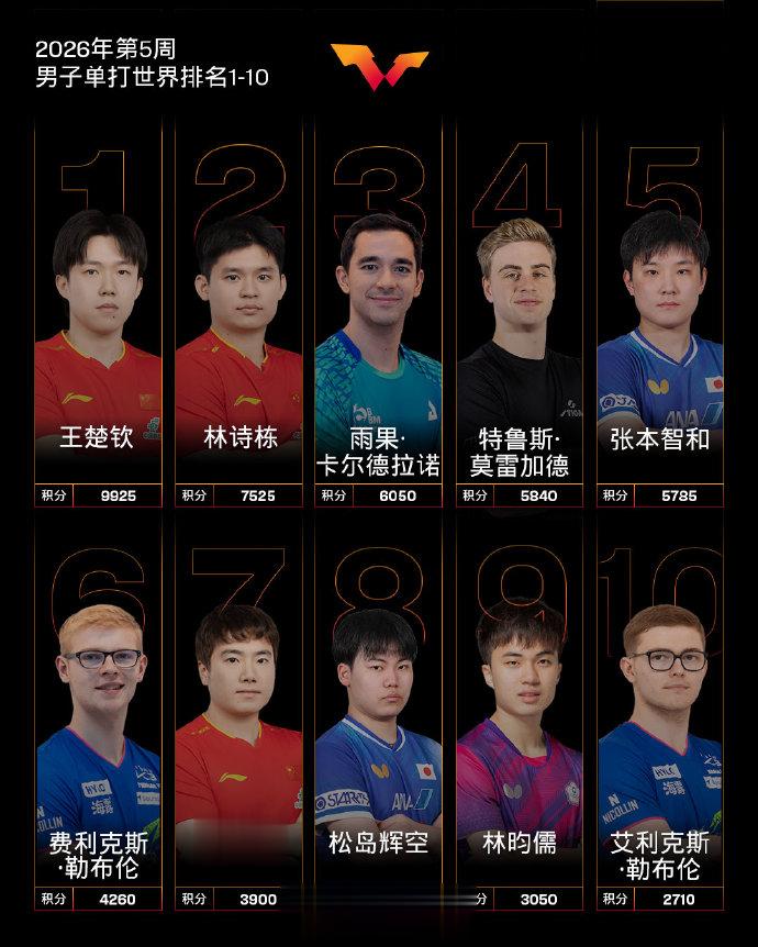 虎扑01月26日讯国际乒联发布2026年第5周世界排名,具体如下: