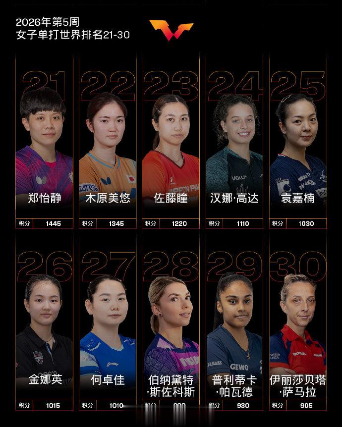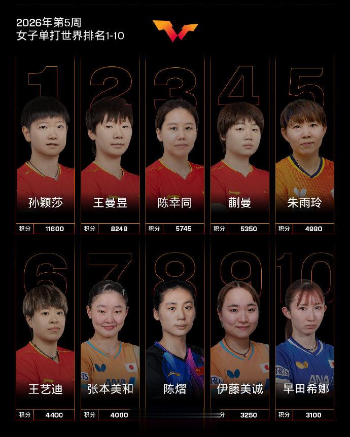 女子单打,中国队球员孙颖莎、王曼昱、陈幸同、蒯曼位列前四,王艺迪位列第六,陈熠位列第八。