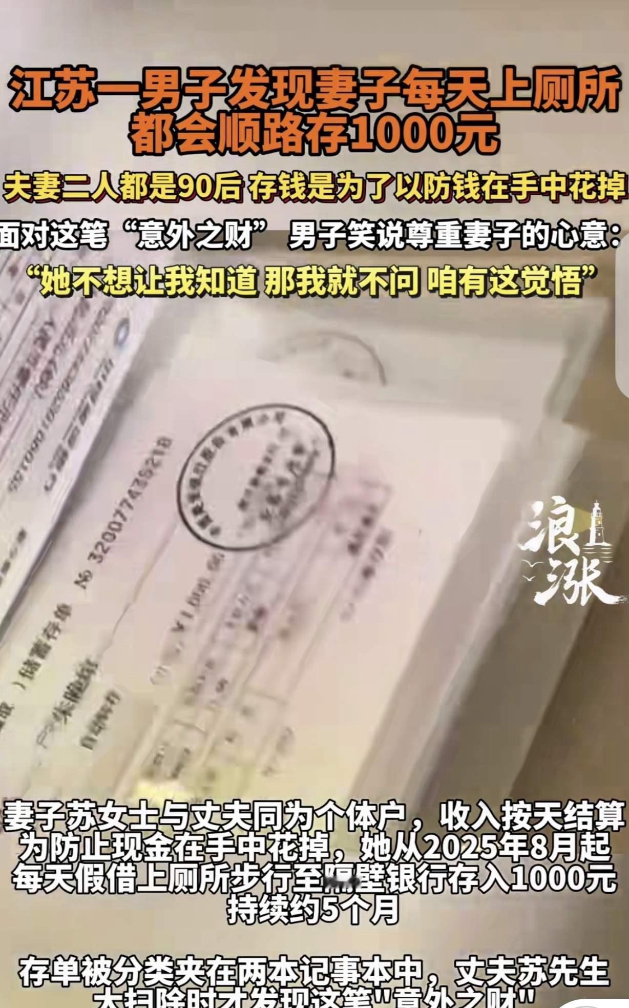【惊天秘密!90后夫妻隐藏20万存款,竟然每天偷偷存钱!】 近日,江苏宿迁一名年轻男子在家中大扫除时,意外发现妻子藏着两本记事本,里面竟夹着200张千元存单,总额高达20万元。这一幕让他震惊不已,也揭开了一个令人深思的家庭秘密。 原来,这对90后夫妻都是个体户,收入按天结算。妻子每天晚上借口上厕所,偷偷跑到邻近银行,将每天的1000元存入银行账户。丈夫此前一直疑惑妻子为何如此神秘,没想到她用这种方式为家庭积蓄未来。丈夫坦言:“她不想让我知道,我就尊重她的选择。” 这段故事引发热议:夫妻之间的信任与隐私该如何平衡?默默存钱背后,是不是每个家庭都在用不同的方式守护未来?你怎么看待夫妻间的秘密存款?欢迎留言讨论! 婚姻 家庭 夫妻 生活 存款