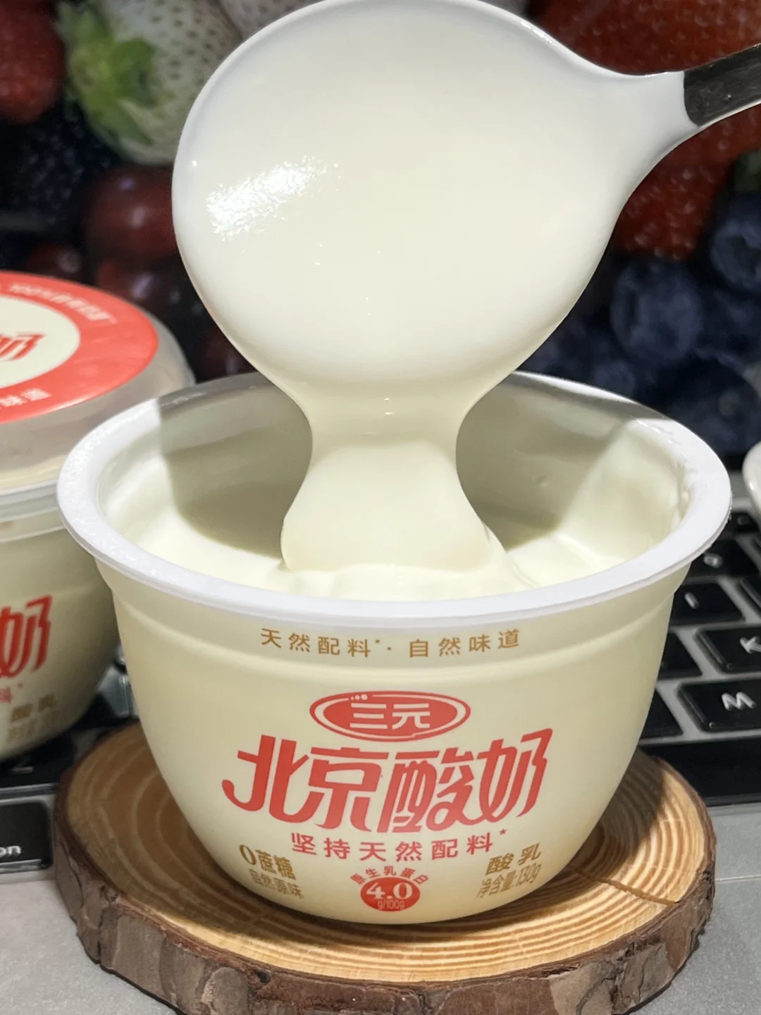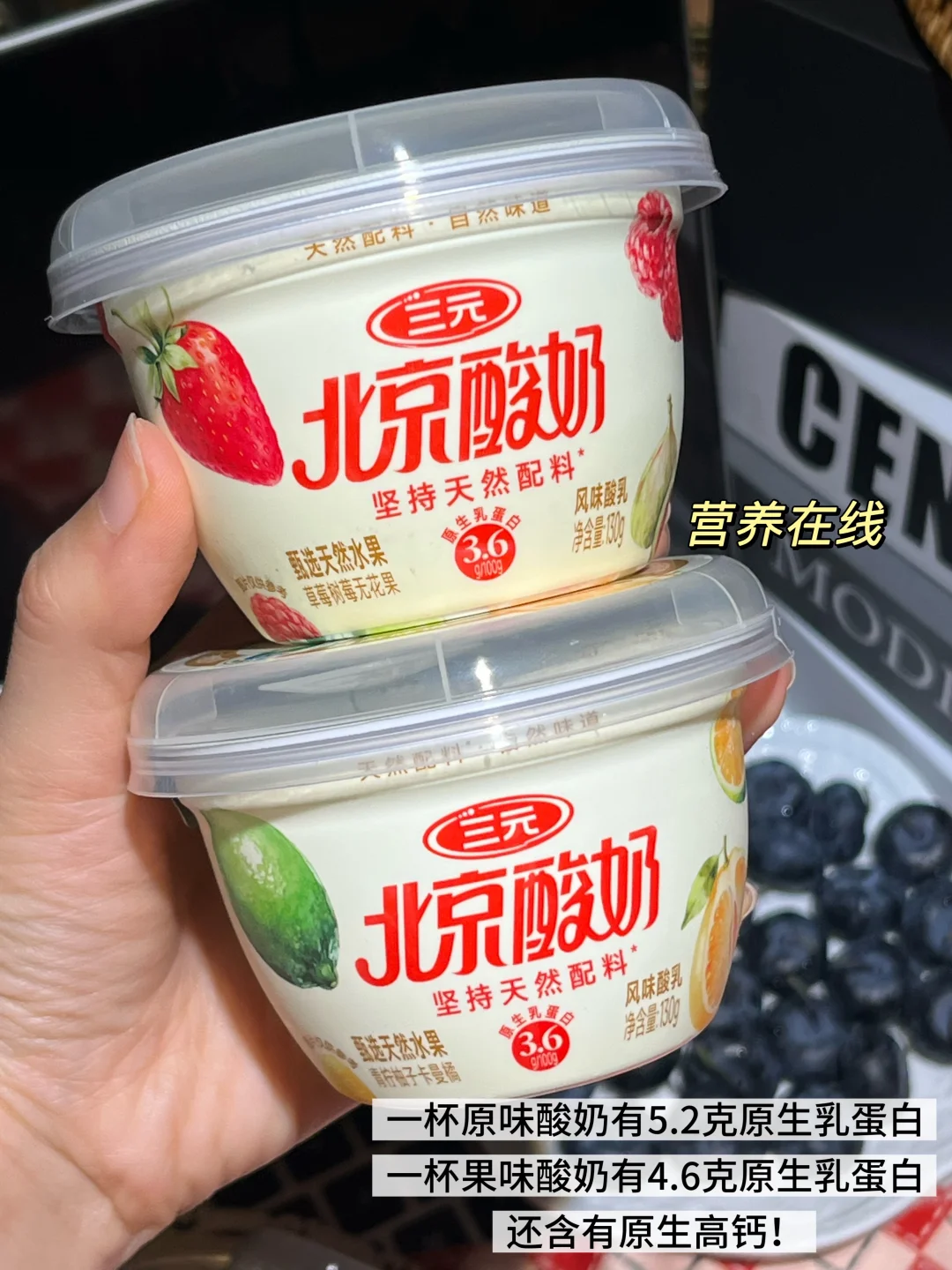 一杯果味三元北京酸奶有4.6g原生乳蛋白、原生高钙和维生素