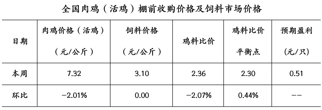 本周全国鸡料比价为2.36,环比下跌2.07%。按目前价格及成本推算,未来肉鸡养殖每只盈利0.51元。