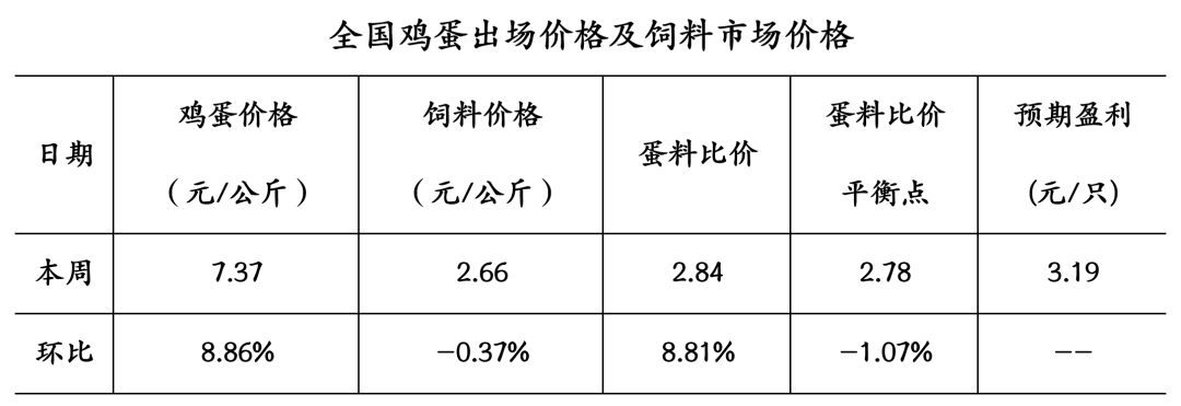 本周全国蛋料比价为2.84,环比上涨8.81%。按目前价格及成本推算,未来蛋鸡养殖每只盈利3.19元。