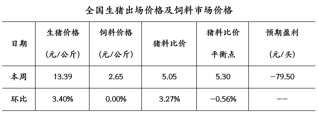 本周全国猪料比价为5.05,环比上涨3.27%。按目前价格及成本推算,未来仔猪育肥模式的生猪养殖头均亏损79.5元。