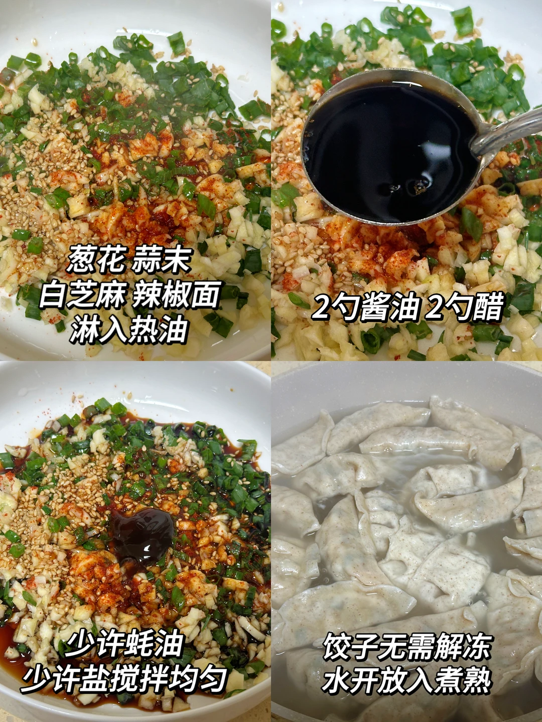 ❶ 蒜末+葱花+辣椒面+白芝麻铺碗底,浇一勺滚烫热油激香,香到直咽口水🤤(怕辣少放辣椒面)