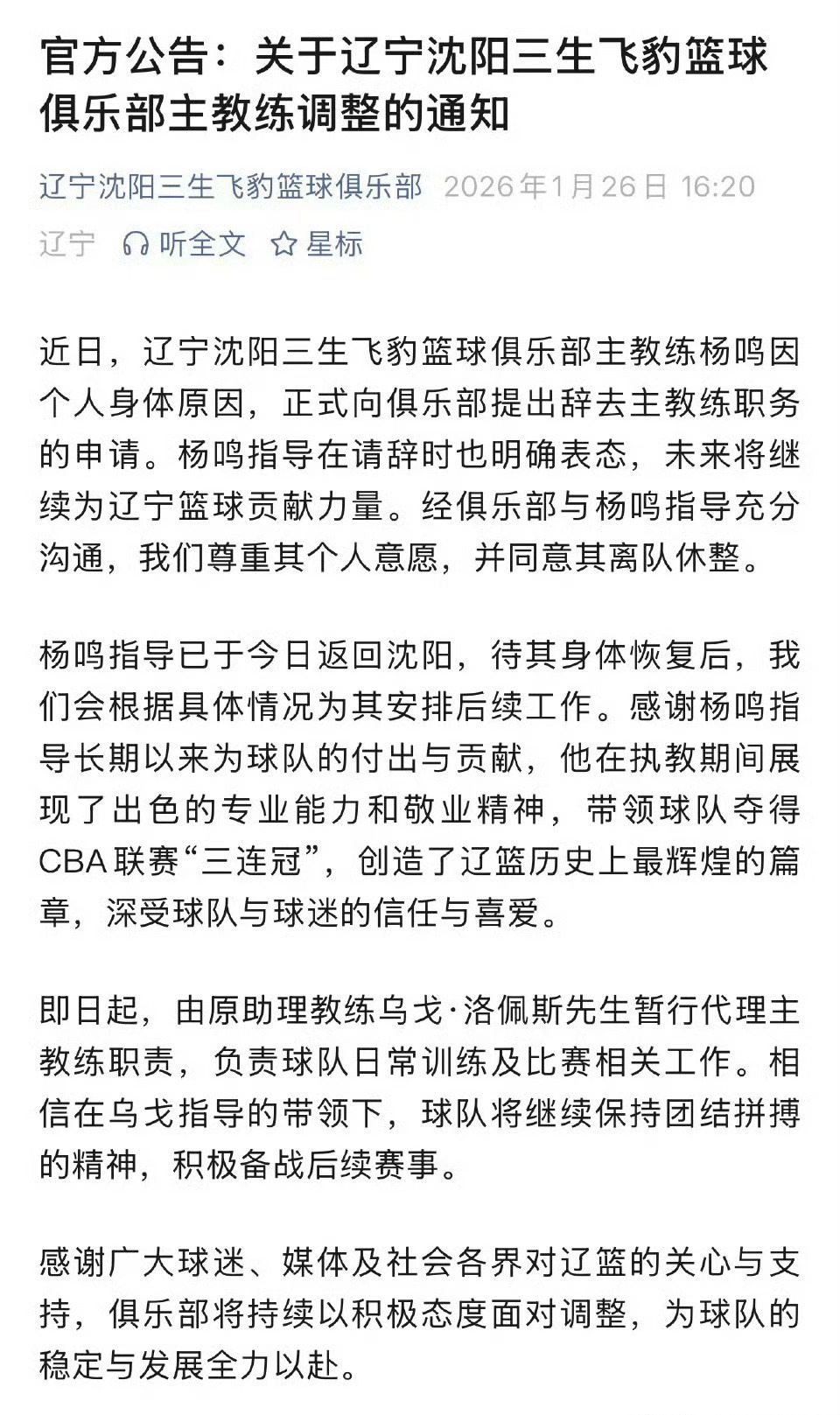 辽宁队官宣:杨鸣正式卸任球队主帅,乌戈暂行代理主教练今日,辽宁男篮官宣:杨鸣正式卸任球队主帅。杨鸣共执教辽宁男篮六个赛季,五次打进决赛,其中三夺CBA总冠军,两次夺得亚军,上赛季打进4强。目前,辽宁男篮常规赛战绩为8胜11负。CBA俱乐部回应杨鸣离职杨鸣因身体原因请辞