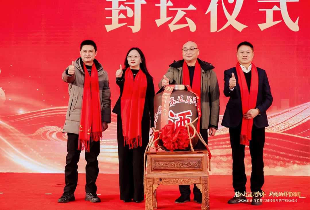 活动现场,承载着东圣三百年匠心传承的2026年腊八新酒完成封坛,窖藏五载的时光佳酿启封并注入酒坛,将整场活动推向高潮。绵竹市人大常委会主任甘志庄严宣布:“2026东圣・绵竹第五届民俗年酒节正式启动!”