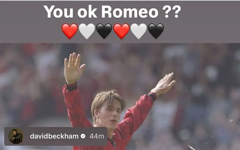 贝克汉姆的二儿子罗密欧则是阿森纳球迷。赛后,贝克汉姆晒出自己曼联球员时期的庆祝照@罗密欧:“你还好吗??”