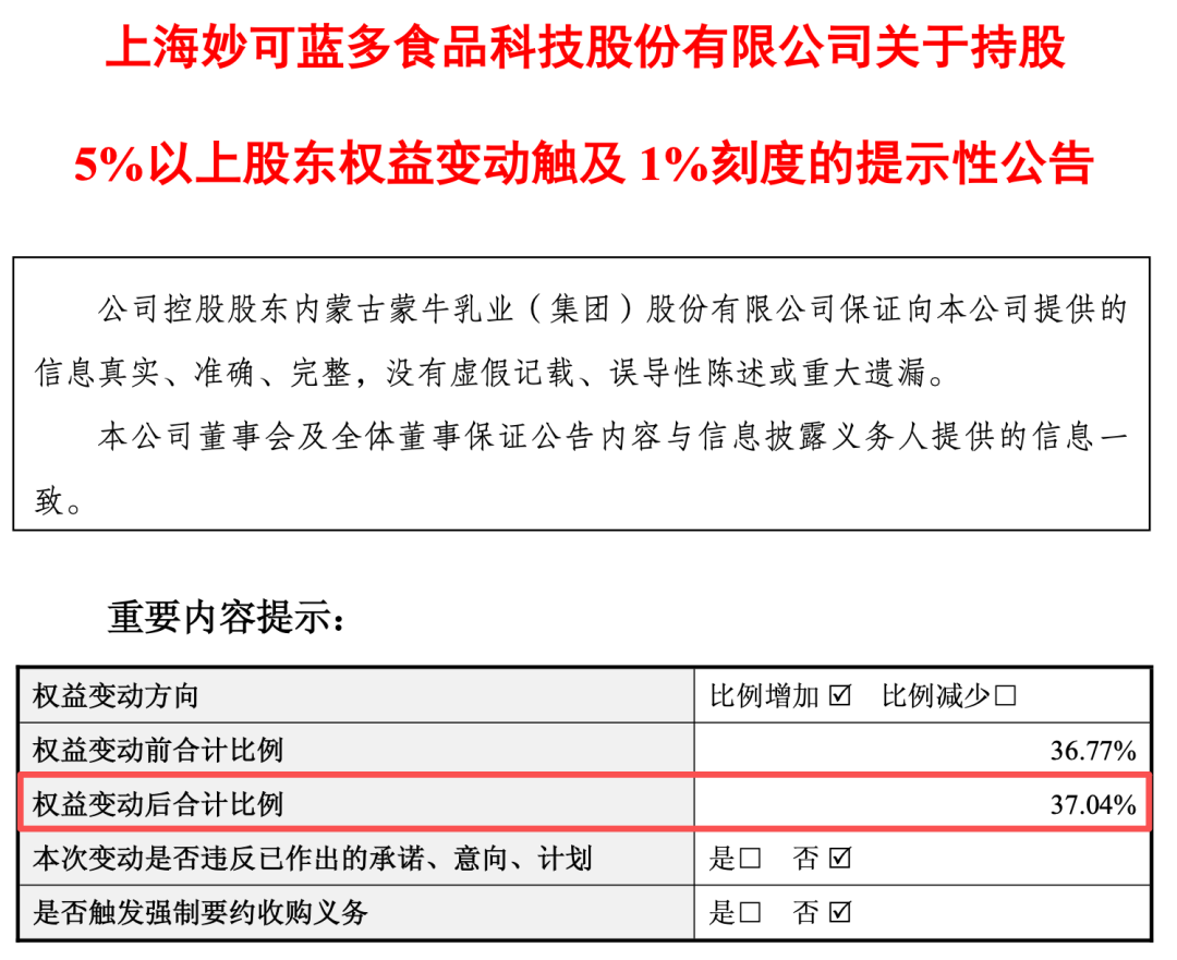 2022年,蒙牛通过要约收购,在妙可蓝多的持股比例进一步提升至35%。而据妙可蓝多最新公告显示,蒙牛的持股比例已经提升至了37.04%。