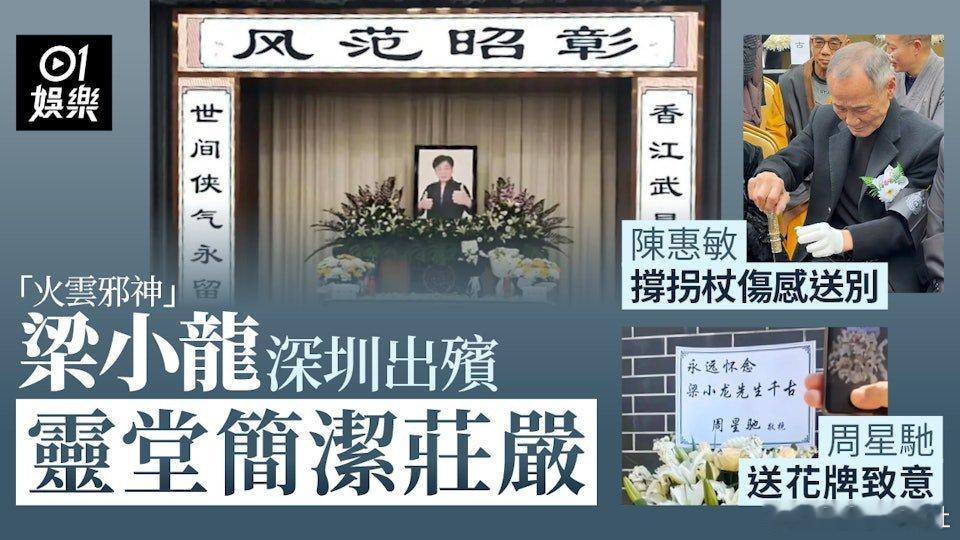 於70年代曾與李小龍、成龍、狄龍號稱「四龍」的著名武打明星梁小龍(原名梁財生),因心衰竭搶救6小時後安然離世,享年75歲,令廣大影迷感到悲痛和不捨。梁小龍喪禮今日(1月26日)在深圳龍崗舉行,好友陳惠敏撐著拐杖前來送別,而生前曾傳不和的周星馳也有送上花牌悼念。梁小龍生前低調,且看透生死,在他離世後,其社交平台繼續更新,貼文,相信是他的身邊人為梁小龍而發,貼文中說:「我到很遠很遠的地方拍電影去了。請原諒我不辭而別,就當我到很遠的地方拍電影去了,本想保密的,所以關門弟子像往常一樣發視頻,我喜歡有點神秘感。」而其生前經紀人兼弟子朱峻賢(丹尼)也有發出聲明,他指身為梁小龍的經紀人,本來是保持緘默:「師父是十四號病逝的,剛開始身邊只有一個親人,之後十分鐘又有兩人趕到,一小時後又有親人趕到。他堅持了七個小時,期間親人一直握著他的手。師父還是去了。師父多次和親人、近人以及我這個經紀人,談過他的生死觀,他說生死有命,他說他喜歡浪漫,如果有一天他不在了,希望大家覺得他到很遠的地方拍電影去了,有點神秘感。」梁小龍的喪禮今日(1月26日)在深圳龍崗殯儀館舉行。殯儀館內外擠滿前往送別的親友和影迷,靈堂內外也擺滿了花牌。從網民拍攝的片段所見,梁小龍的遺照放在靈堂正中央,家人亦遵從其生前意願,佈置一切從簡,靈堂顯示器上方寫著:「風範昭彰 」的白底黑字橫幅,兩旁則寫有:「香江武星今隕落」和「世間俠氣永留存」。據前往送別的網民透露,家人為了照顧影迷,特意開設兩個靈堂大廳,一個是開放給影迷與網民;另一個則供親友個徒弟們進行悼念。片段所見,到靈堂悼念的人絡繹不絕。老友陳惠敏即使行動不便,仍撐著拐杖現身,他戴上黑紗,在友人攙扶著進入靈堂,神情盡顯哀傷;另外,白彪、林威及黃夏蕙等,也有親自到場送別故友最後一程。至於曾因拍攝《功夫》而與梁小龍傳出不和的周星馳,亦送上花牌,並寫道:「永遠懷念 梁小龍先生千古,敬挽」。梁小龍見證了香港動作電影的興衰,早在1970年代就與李小龍、成龍、狄龍並稱「四龍」,1980年代,他於香港麗的電視劇《大俠霍元甲》演出劇中霍元甲大徒弟陳真,紅遍大江南北。後來梁小龍曾一度淡出香港娛樂圈轉戰商界,至2004年,他復出參演周星馳電影《功夫》,憑飾演終極反派「火雲邪神」,將其事業推上另一個高峰。