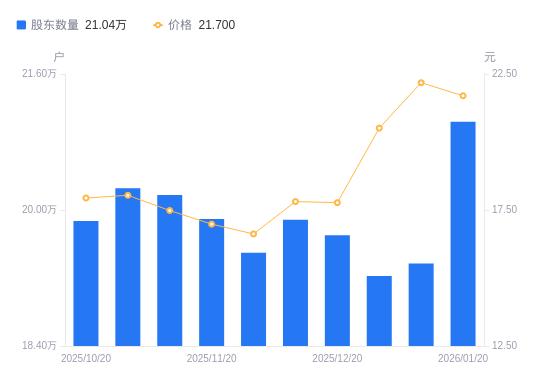 日期A股户数(户)流通A股户均持股数(股)户均持股市值(万元)2026-01-202103859523.4620.672026-01-1019371810342.8322.942025-12-3119222410423.2221.382025-12-2019702510169.2318.072025-12-1019885910075.4517.942025-11-3019497410276.2117.082025-11-2019894410071.1417.102025-11-102017659930.3317.362025-10-312025659891.1117.842025-10-2019871110082.9518.09