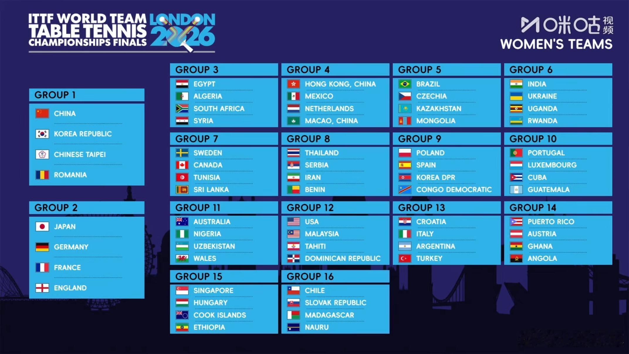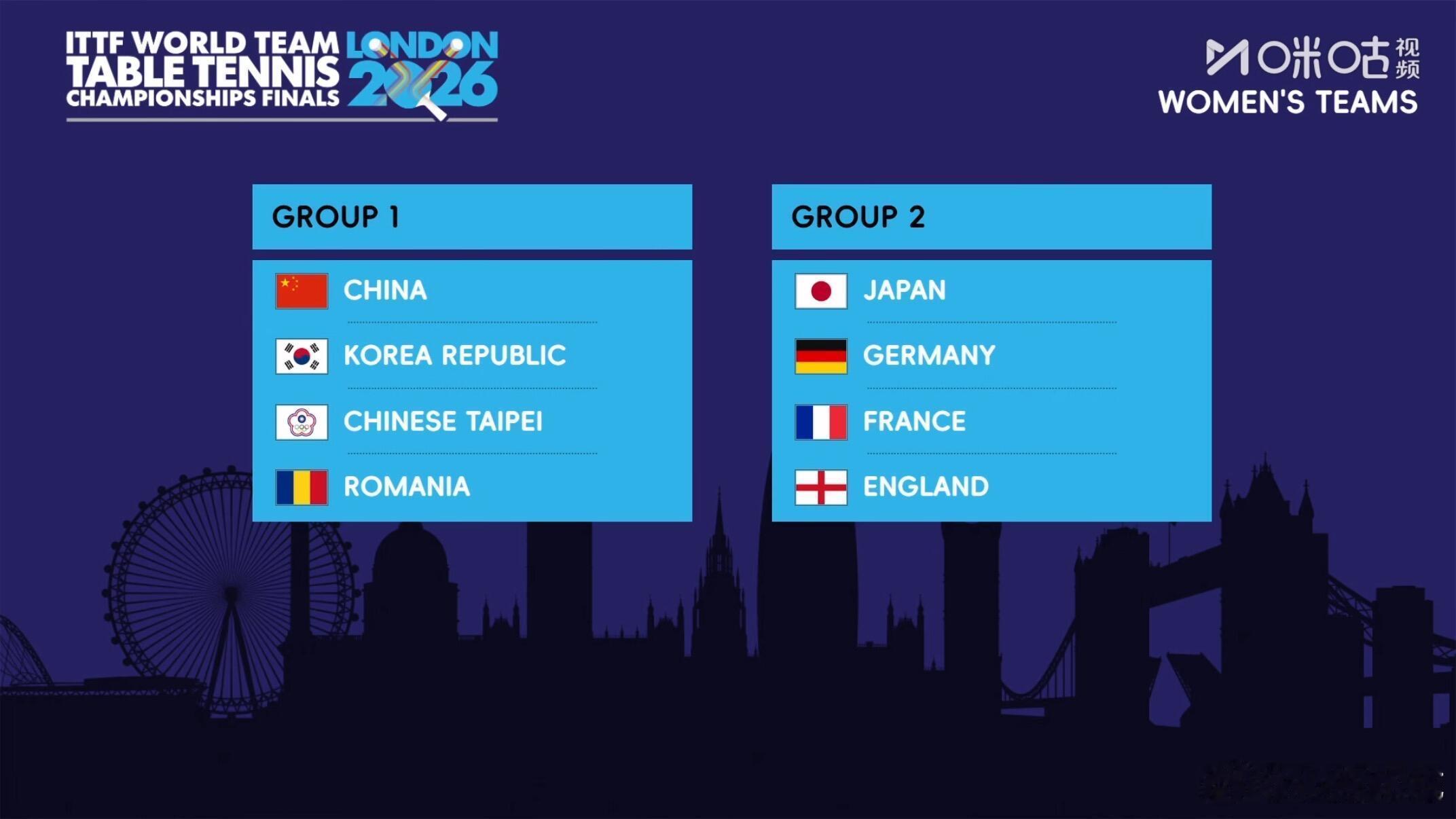 国乒女团与韩国中国台北罗马尼亚同组伦敦世乒赛分组抽签出炉2026年伦敦世界乒乓球团体锦标赛抽签2026年伦敦世界乒乓球团体锦标赛(女子组)第一组• 中国• 韩国• 中国台北• 罗马尼亚第二组• 日本• 德国• 法国• 英格兰2026年伦敦世界乒乓球团体锦标赛(男子组)第一组• 中国• 瑞典• 韩国• 英格兰第二组• 法国• 日本• 德国• 中国台北