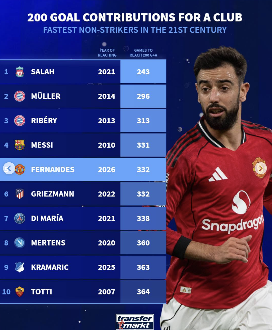 萨拉赫以243场居首,穆勒以296场排第二。本轮联赛达成这一成就的B费以332场排名第五。