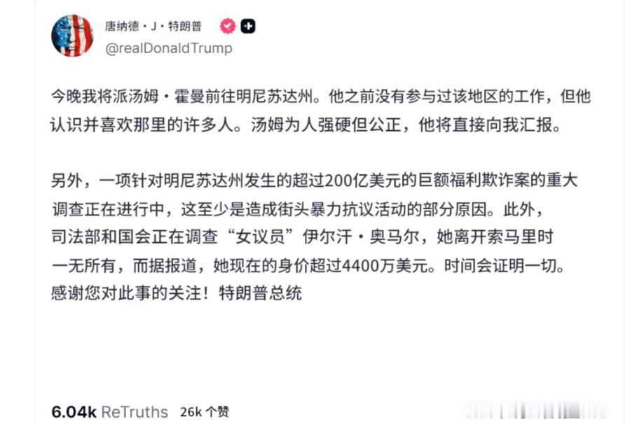 特朗普一天之内两度发文要求彻查民主党索马里裔参议员伊尔汗·奥马尔涉嫌高达90亿美元的诈骗案,此人如何从资产负债到现在身价超4000万美元。 这原本是一项美国政府针对低收入家庭及儿童的食品和住房补贴计划,2020年,在伊尔汗·奥马尔的推动下通过了《膳食援助法案》,而这部法案主要是简化此前补贴计划的手续流程,让低收入家庭更容易获得补贴,看似是好事,但是这也让诈骗分子找到了机会。 而据2025年美国司法部的一项调查报告显示,联邦拨付的补贴资金中有高达90亿美元不翼而飞,最终都落入了诈骗分子的口袋中,而诈骗的重灾区正好在伊尔汗·奥马尔所在的明尼苏达州索马里裔移民最大的聚居区,伊尔汗·奥马尔本身也是索马里裔。 这还没完,调查还发现伊尔汗·奥马尔个人资产从当选议员时的负债4.5万美元,到现在短短几年间身价超过4000万美元,但这些财富都不在其名下,而是在他丈夫蒂姆·迈内特名下的两家公司。同样神奇的是这两家公司在2023年初时估值几乎为零,2024年就像坐了火箭一样资产估值疯狂飙涨。 其实在拜登时期的时候,FBI就介入了调查,但是随后不知什么原因拜登政府阻止了继续调查。直到现在特朗普为了转移明尼苏达州抓捕移民造成的恶劣影响,强力要求司法部重启调查,大家搬好凳子准备吃瓜。