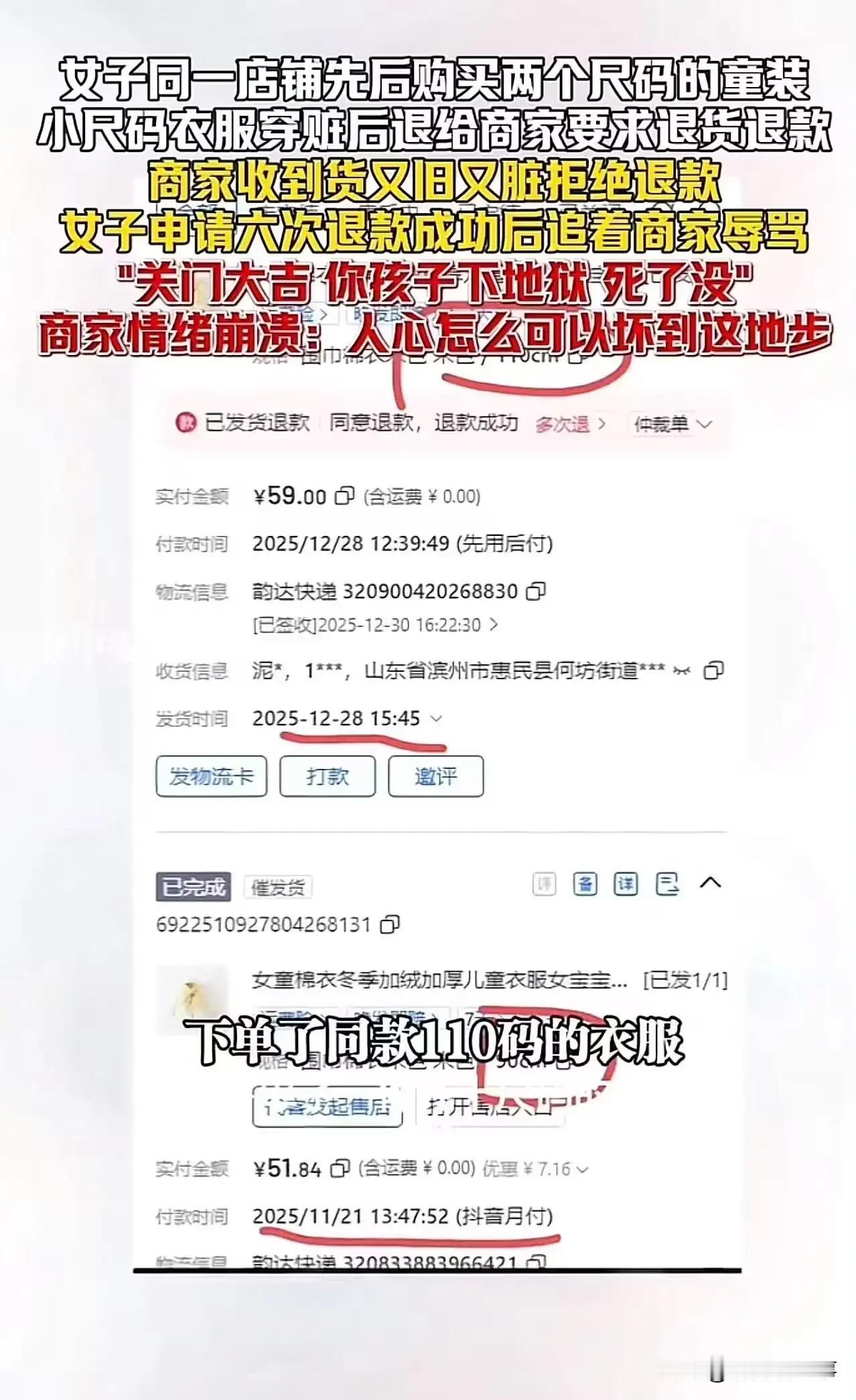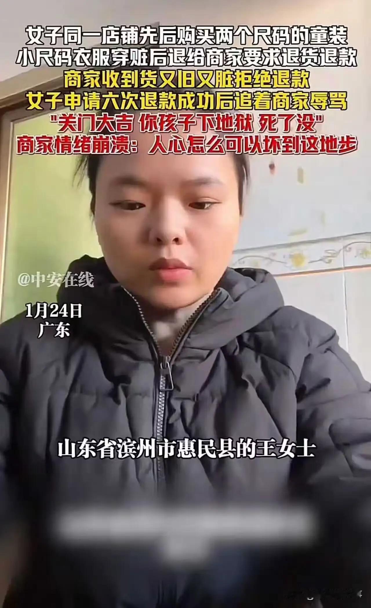 “太缺德了!”某记者网购童装,穿的又脏又旧后申请退货退款,商家拒绝退款,该记者私信辱骂商家:“关门大吉,你孩子下地狱!”商家情绪崩溃,发视频怒斥:人心怎么可以坏到这地步?你作为妈妈给孩子穿着你白嫖来的衣服,你对得起你的孩子吗? 这场“童装退货事件”看似一场普通的消费纠纷,却折射出当下社会中最令人心碎的人性裂痕。我们常说,孩子是未来,是希望,但当大人们的价值观扭曲到如此扭曲的地步,谁还能相信这个未来会光明吗? 事情的起因其实很简单:一位记者在网购童装后,发现衣服不仅脏旧,还明显不符合宣传的质量标准,于是提出退货退款。可是,商家拒绝了。看似普通的“消费维权”,却因为那句“关门大吉,你孩子下地狱”的辱骂,瞬间变成了社会的焦点。一个成年人,竟然可以为了几件衣服,口出如此恶毒的话语,甚至辱骂对方的孩子。这不仅仅是一次简单的争执,更像是一面镜子,映照出人性中最阴暗的一面。 有人说,这只是个别人的情绪失控,但我更愿意相信,这反映了某种深层次的社会心态。我们在快节奏的生活中,越来越习惯用激烈的言辞来表达不满,甚至用攻击性的方式来“发泄”。而这种行为背后,隐藏着的是一种对他人的冷漠与不尊重。更令人担忧的是,许多人的价值观被扭曲成只看“自己”的利益,甚至不惜用恶劣的言辞伤害无辜的孩子。 但值得深思的是,那个商家面对如此恶劣的辱骂,情绪崩溃,发出控诉:“你对得起你的孩子吗?”这句话,像是一记重锤,击中了我们每个人的良知。作为父母,我们是否也曾在压力和愤怒中,失去理智?我们是否也曾用言语伤害过身边的人?这场争执,或许是一个警钟:当我们用“惯着”或“贴脸开大”的方式去面对生活的挫折时,是否也在无意中培养出一种冷漠和自私? 我们不能否认,社会的变迁带来了诸多挑战,但更重要的是,我们要反思:在利益和情绪的拉扯中,是否还能坚守那份最基本的人性善良?那份对他人的尊重?每一次的愤怒和攻击,背后都隐藏着一份未被满足的需求和一份被忽视的情感。只有当我们学会用理解和宽容去面对问题,才能真正化解矛盾,避免悲剧的发生。 这场童装退货事件,或许只是冰山一角,但它提醒我们:在这个复杂的社会中,保持一颗善良的心,比任何时候都重要。我们每个人都应该问问自己:在面对冲突时,我们是否还能保持理智?在面对不公时,我们是否还能坚持底线?只有这样,我们才能共同营造一个更温暖、更有希望的社会。