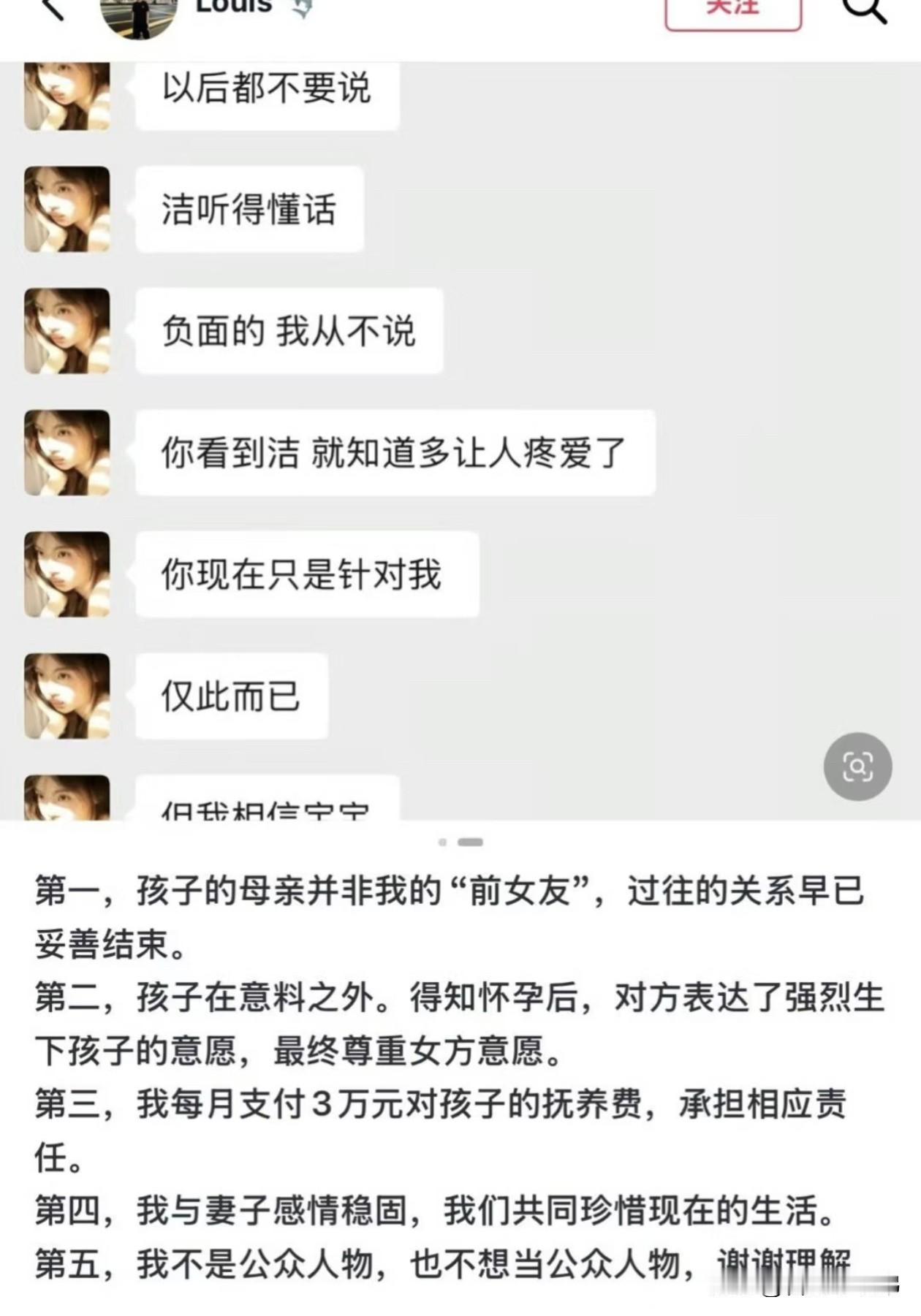 在中国我们不说分手陈雪凝老公李瑞滨终于正面回应! 五点核心信息划重点:承认有孩子但孩子妈并非网传前女友,二人关系在孩子被发现前就已结束;孩子是意料之外的到来,是尊重女方意愿才生下;目前每月固定支付3万抚养费;更强调和陈雪凝感情依旧稳定,恳请外界不要过度打扰。 意料之外的孩子、3万抚养费、与正主感情无虞,这波回应把关键问题都挑明了,你怎么看[what]?