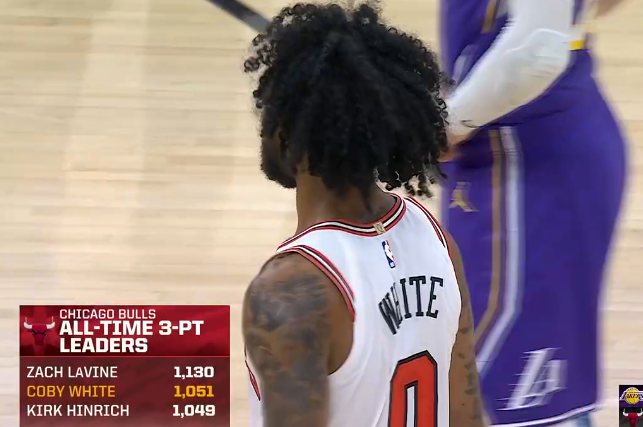 科比-怀特生涯投进1051记三分,超越辛里奇升至公牛队史第二