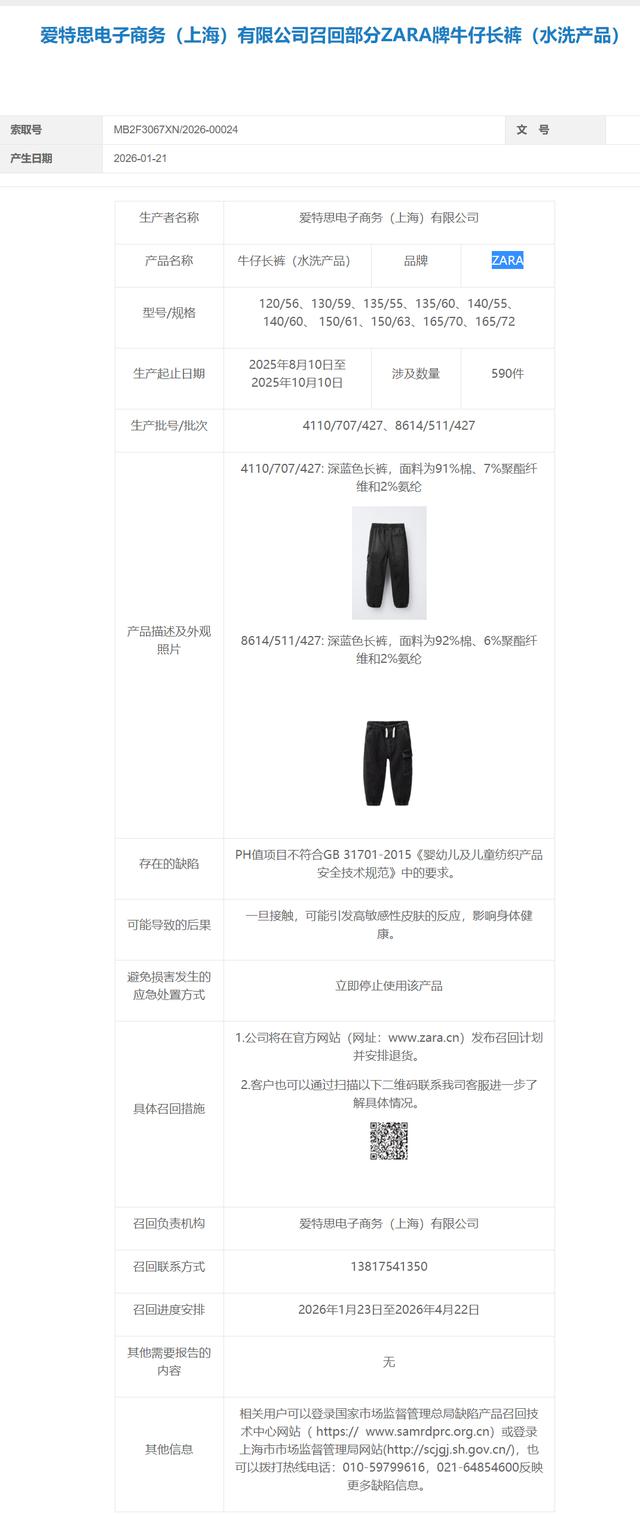 3620件ZARA婴童服饰被召回