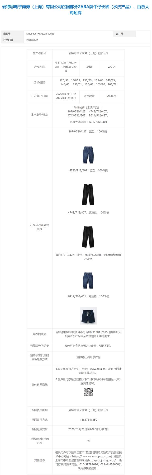 近日,上海市市场监管局发布召回信息,爱特思电子商务(上海)有限公司召回3620件“ZARA”婴童服饰,涉及: