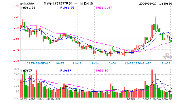 1月27日,截止午间收盘,金融科技ETF博时(516860)跌1.55%,报1.465元,成交额4831.95万元。金融科技ETF博时(516860)重仓股方面,东方财富截止午盘跌1.63%,同花顺跌1.32%,指南针跌2.04%,恒生电子涨0.65%,润和软件跌2.61%,东华软件跌3.70%,新大陆跌2.76%,广电运通跌0.98%,银之杰跌2.22%,四方精创跌2.17%。