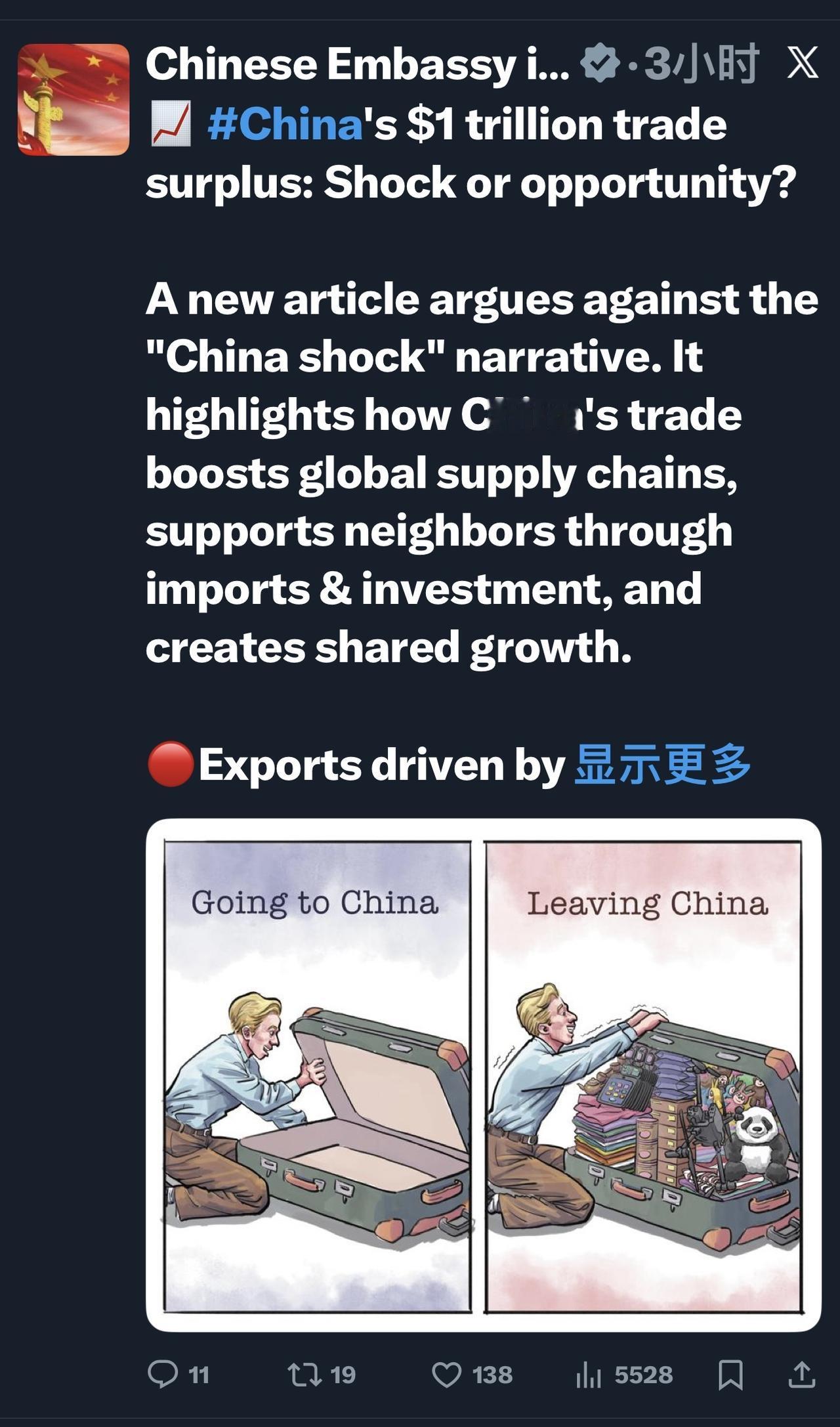 中国驻美大使馆发了一张图,生动地阐述一个事实:和中国打交道(做生意),来时两手空空,离开时满载而归…… 你说这个1万亿美元的贸易顺差:冲击还是机遇?不言而喻