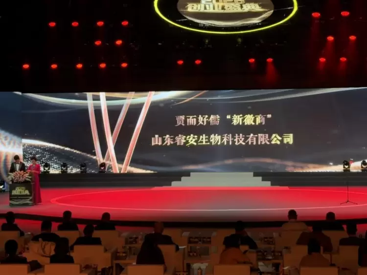 盛典现场,山东睿安生物科技有限公司被正式授予“新徽商代表”称号。这一荣誉旨在表彰其秉承传统儒商诚信仁义的精神内核,同时融合现代创新创业理念,在生物科技领域取得的卓越成就与产生的典范效应。随后,安书怡董事长代表公司上台领取了“新徽商奖”颁奖,该奖项是对企业在技术创新、社会责任与可持续发展方面所作出突出贡献的权威认可。