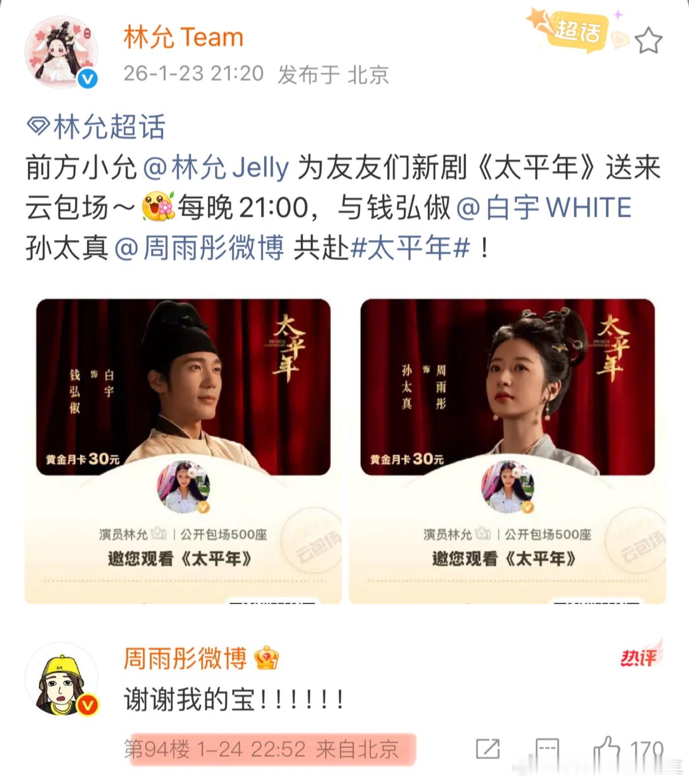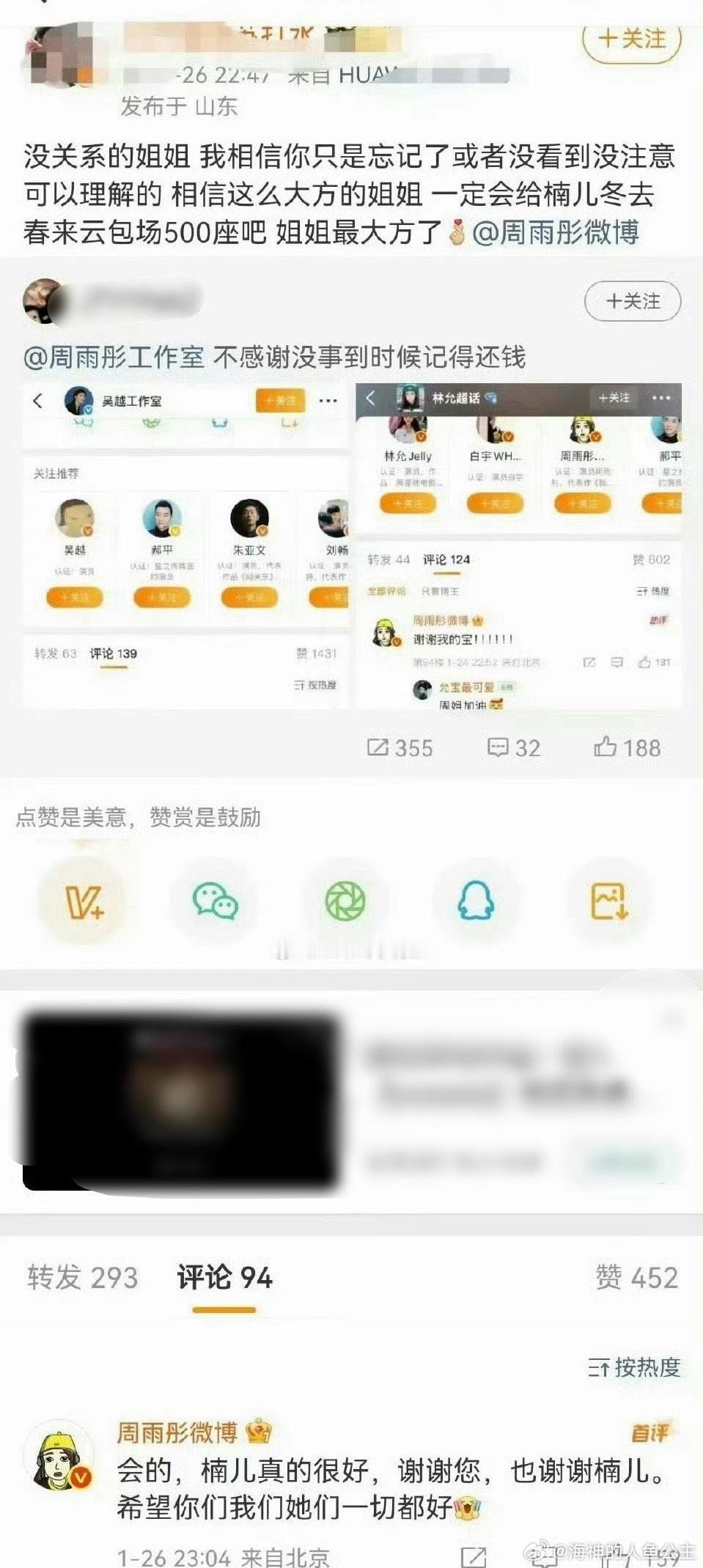 周雨彤回复了章若楠粉丝 拉 一 下 时 间 线章若楠工作室1.23日14:05发了☁️包 场吴越工作室1.23日17:17发了☁️ 包 场林允工作室1.23日21:20发了☁️ 包 场1.26日章若楠粉丝质疑周雨彤区别对待也就是说章若楠是最早发的,周雨彤分别在1.23日回复了吴越,1.24日回复了林允,1.26日23:04周雨彤回复了章若楠粉丝,23:21才姗姗来迟感谢了章若楠工作室