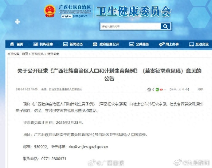 【#广西拟额外增加15天婚假#】1月23日,广西壮族自治区卫健委发布《广西壮族自治区人口和计划生育条例》(草案征求意见稿),面向社会公开征求意见。草案第二十七条提出,依法登记结婚的夫妻,在国家规定婚假基础上,可额外增加婚假十五天。