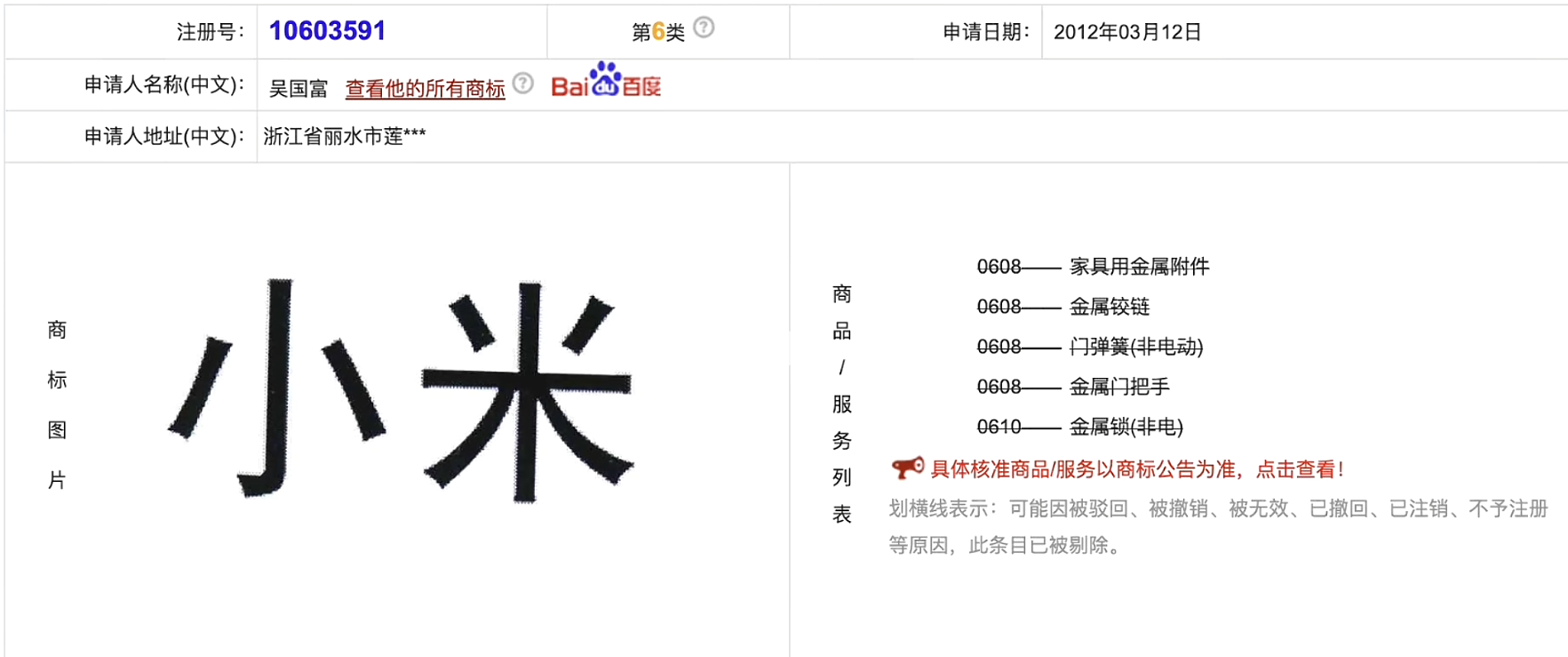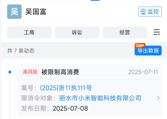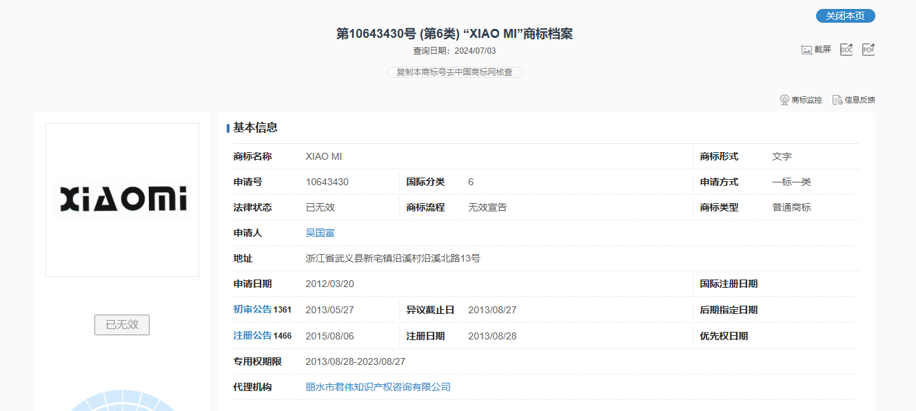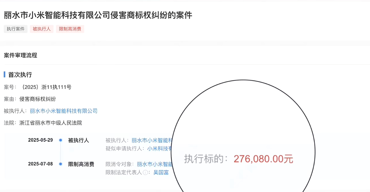 丽水小米负责人回应商标侵权案 捋了一下事情经过,大概就是小米起诉了一个叫“丽水小米智能科技有限公司”的卖家具的公司,老板吴国富也是老一套说辞,认为自己既不侵权、也不攀附,北京那个小米是“科技有限责任公司”,他是“智能科技有限公司”,完全不相关,不知道小米敏感什么。于是在2025年2月他也发了一个视频,表示自己对得起国家对得起社会,合法纳税,只为养家糊口。话里话外反正就是“小米雷军不让群众卖小米”(是不是有点眼熟?)。最后在2025年5月丽水中级人民法院一审宣判,吴国富的小米智能科技优先公司侵权并赔偿27.608万元。但抽象的是,这么大一个老板,因为27.608万元赔不起,目前已经被限制高消费。那法院为什么会判“丽水小米智能科技有限公司”败诉呢?别的也不说了,我翻出来几个图,大伙儿不妨看一下。在2012年3月(北京小米成立2年后),他就已经开始申请“小米”的中文商标,主要涉及一些门把手、门锁等等家具配件,不过基本都被驳回,不过那会儿小米刚起步,一些人不熟悉,所以申请重复了也情有可原;但不能忍的是随后他申请了(图6)的拼音商标,尤其是那个MI字几乎和小米商标一致,你说这个不是侵权、攀附这是什么?随后的十几年,不死心的吴老板随后逐渐把自家的官网风格逐渐对齐北京小米官网,甚至在2022年小米智能家居开始兴起之后,他又跑去申请了“小米智能大家居”的商标。更牛逼的是,吴老板申请的“小米”商标在被宣告无效之后,他连续发起了足足45次复审申请(图9),这个毅力也是没谁了;当然还有更抽象的,他除了霍霍小米之外,他还去霍霍“钉钉”,没错就是阿里的那个钉钉,甚至还申请了神似“卡西欧”的商标。吴老板肯定是不服的啊,他一边拍视频说小米雷军起诉他赔500万(实际也就27.608万,他还赔不起被限制高消费),然后就是拍拍一些恶心小米的视频,说“今年小米要黄了”,顺带声援一下山东那个说不让农民卖小米的村支书。一些人一边扮演弱者,一边行蝇营狗苟之事,企图用伪造事实来博取大众同情的方式干扰司法和舆论,不过我还是相信,法律是公正、公平的,目前这起案件已经到了最高院那边,期待能有一个公平、公正的结果。