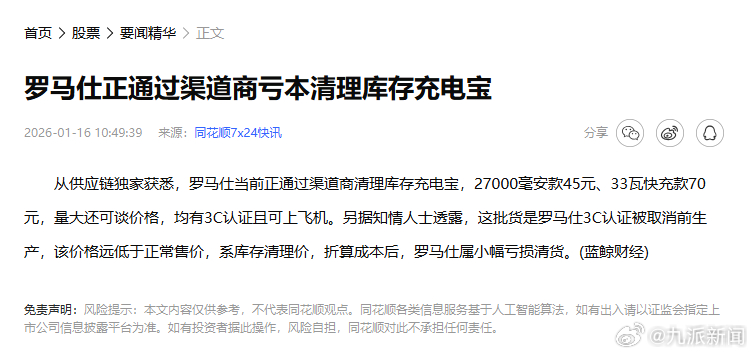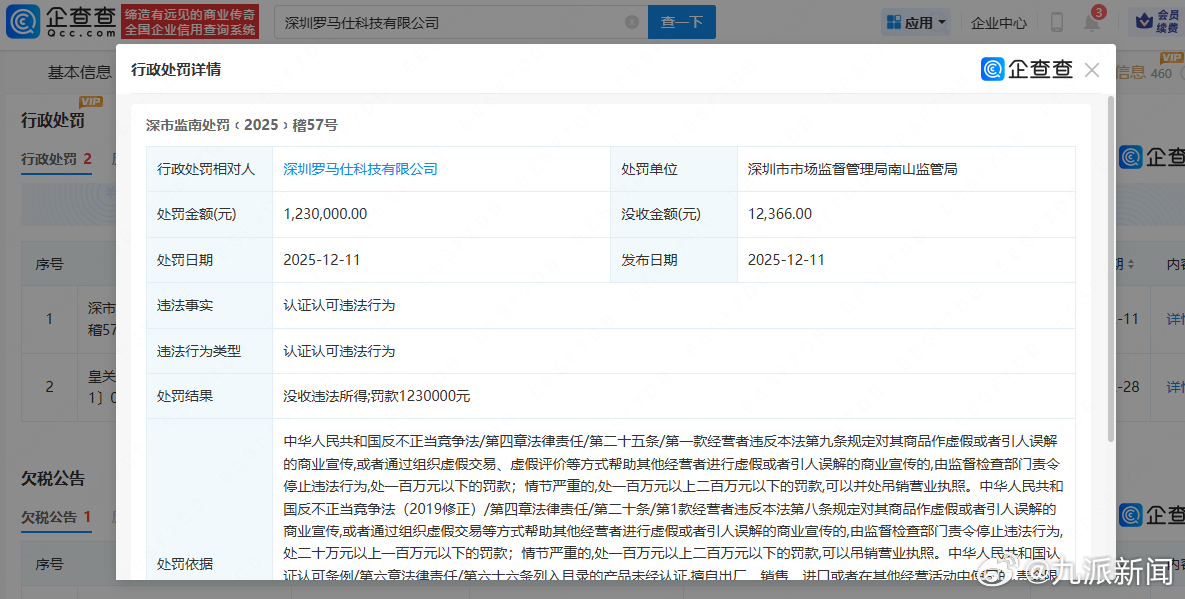 【#罗马仕因认证认可违法被罚123万#】#罗马仕被曝通过渠道商亏本清库存# 1月27日,央视新闻报道深圳罗马仕科技有限公司在未取得相关型号充电宝强制性认证证书情况下,擅自委托生产和销售充电宝产品。同时,在明知部分充电宝电芯容量衰减,实际电池容量已达不到10000mAh时,仍在产品显著位置进行虚假标注,属地市场监管部门依法对该公司作出行政处罚。从企查查APP获悉,2025年12月,深圳罗马仕科技有限公司因认证认可违法行为被罚款123万元并没收违法所得。此外,近日,罗马仕被曝当前正通过渠道商清理库存充电宝,知情人士透露这批货是罗马仕3C认证被取消前生产,该价格远低于正常售价,系库存清理价,折算成本后,罗马仕属小幅亏损清货。#罗马仕被处罚#