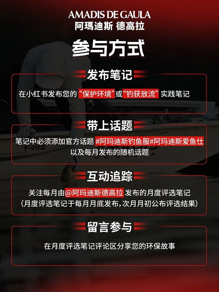 活动中,品牌每月将评选出3名优秀参与者成为月度“爱鱼仕”,并奖励阿玛迪斯当季热门钓鱼服一件;年终将从月度获奖者及持续参与者中,评选出“爱鱼仕·年度守护者”“爱鱼仕·环保先锋”“爱鱼仕·行动达人”三大奖项,最高可获得“一年四季”高端钓鱼服四套。