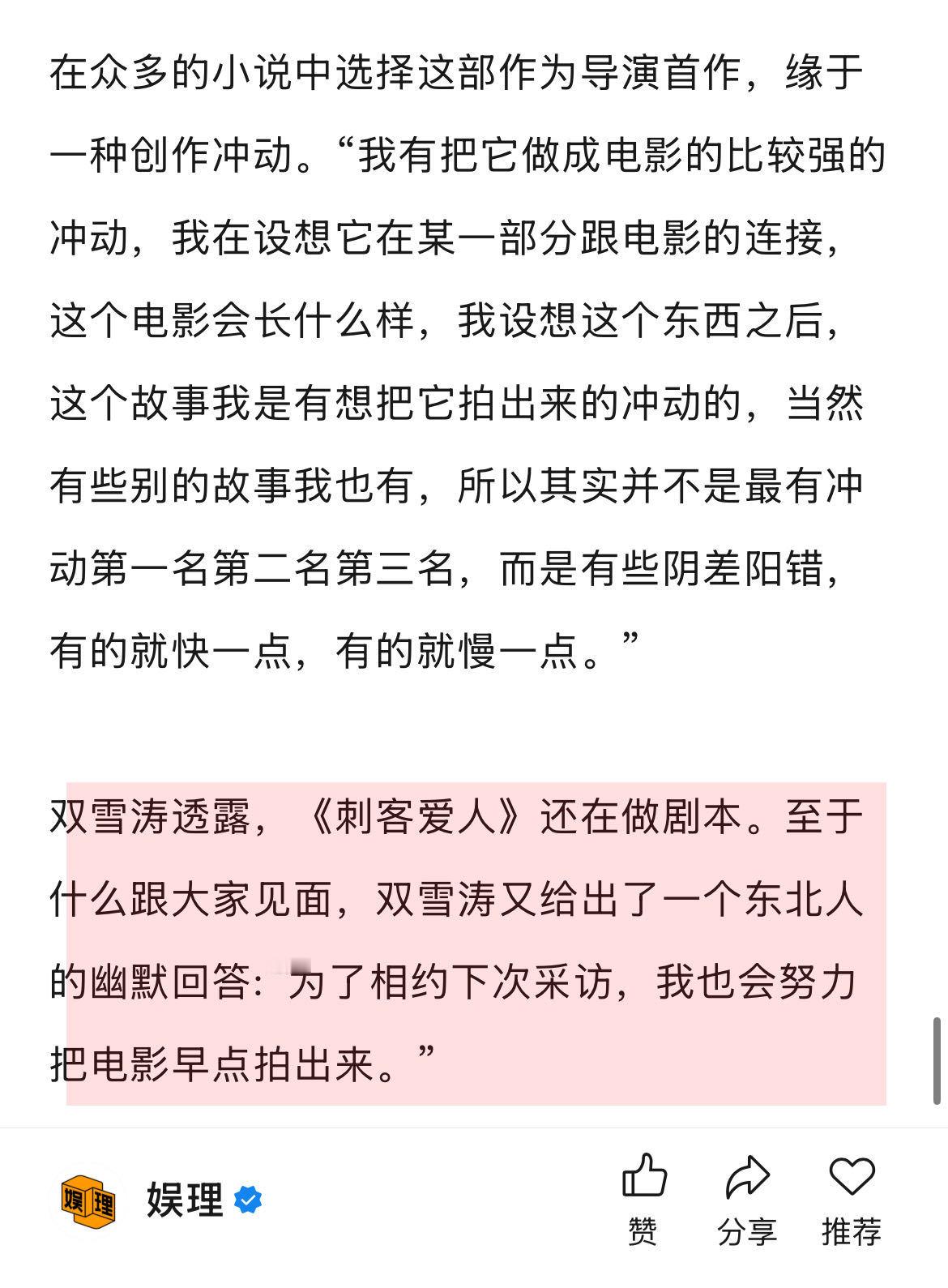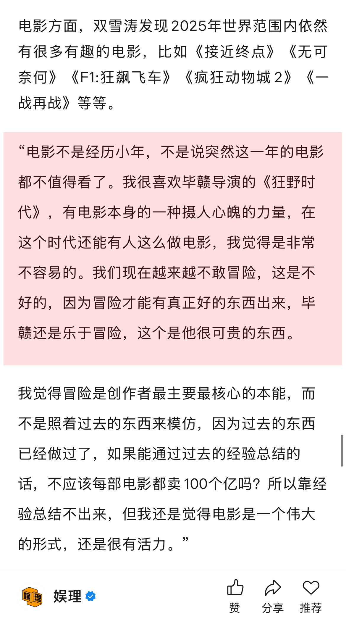 双雪涛回应作品被多次改编双雪涛喜欢不完全遵从原著的改编 发现2025年世界范围内依然有很多有趣的电影,比如《F1:狂飙飞车》《疯狂动物城2》《一战再战》等等。“电影不是经历小年,不是说突然这一年的电影都不值得看了。我很喜欢毕赣导演的《狂野时代》,有电影本身的一种摄人心魄的力量,在这个时代还能有人这么做电影,我觉得是非常不容易的。”娱理独家↓