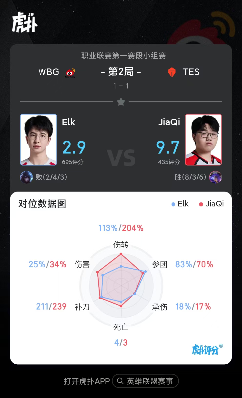 虎扑01月27日讯JiaQi芸阿娜打出8/3/6战绩,拿到TES对阵WBG次局比赛MVP