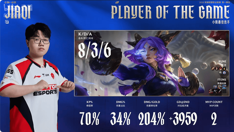 JiaQi芸阿娜打出8/3/6战绩,拿到TES对阵WBG次局比赛MVP