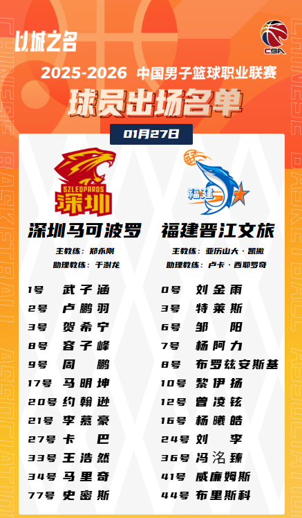 虎扑01月27日讯今晚CBA常规赛,深圳对阵福建的大名单已经公布。