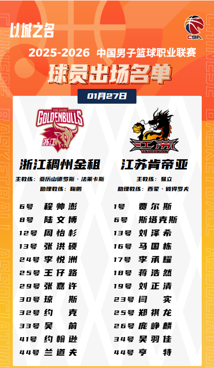 虎扑01月27日讯今晚CBA常规赛,江苏对阵浙江的大名单已经公布。