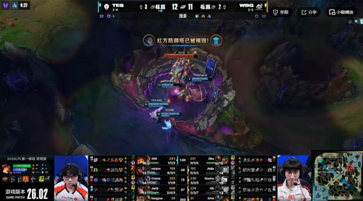 [19:02]TES上路三人抓死Xiaohu瑞兹,WBG三人中路越塔强杀JiaQi女枪!TES拆掉对手上路双外塔,WBG换掉了TES的中一塔!