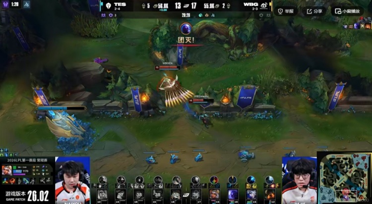 [17:00]Elk艾希中路有点装了,结果直接被支援的Creme塞拉斯配合JiaQi女枪扫大强杀!TES还可以拿到先锋!WBG换掉第二条小龙!