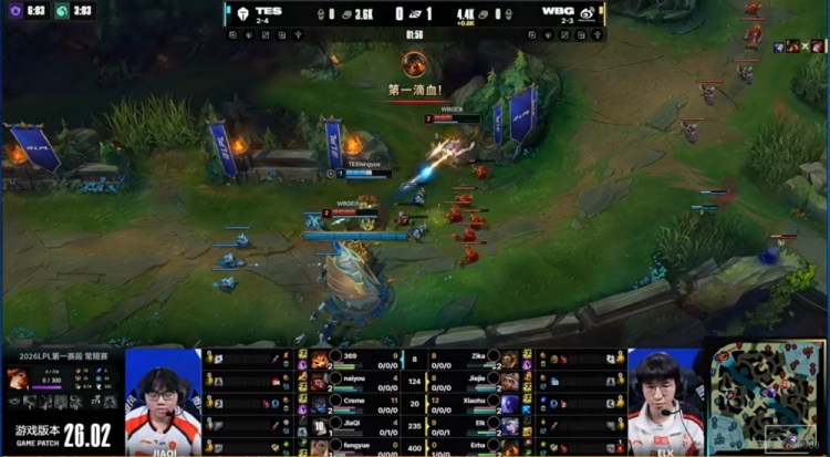[1:56]下路对线WBG打出血量优势,Elk艾希抗塔直接帮助Erha泰坦越塔拿下一血!但是Fengyue芮尔非常能打,升2级戳两个,配合小兵伤害拿下双杀,这波反而是TES的1换2!