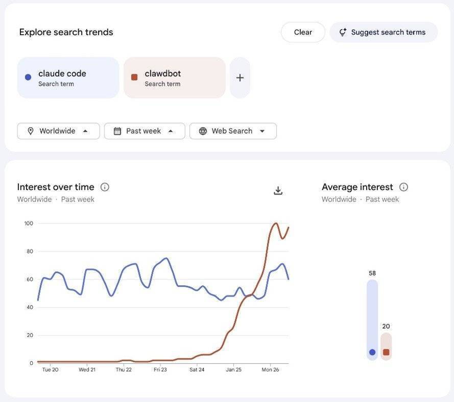 截止目前,Clawdbot(Moltbot)在Github的星数已经超过6万,收藏数超过7200。而对比Clawdbot(Moltbot)与ClaudeCode的谷歌数据可以发现,过去三四天里前者的搜索指数急速攀升,目前已经大幅度超过Anthropic旗下的终端AI编程助手ClaudeCode。