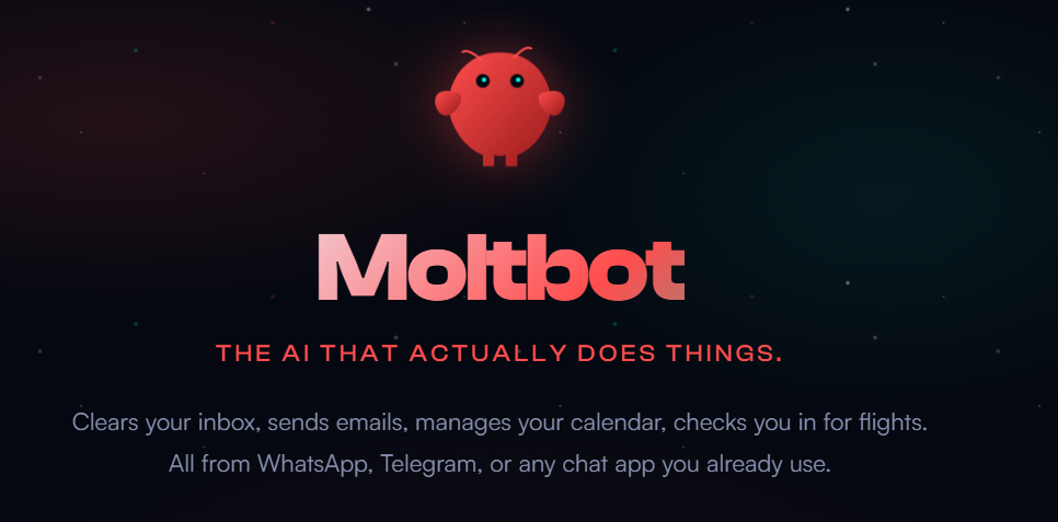 在项目官网上,开发者在Moltbot的名字下方用一句话概括了其定位:一款真正做事的AI(TheAIthatactuallydoesthings)。
