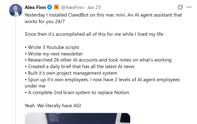 科技创业者AlexFinn已经沉迷于Moltbot很多天,并将它打造成自己的全天候助理。在1月25日这天,Moltbot就帮他完成了这么多任务: