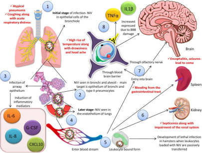 尼帕病毒在人际间传播主要发生在病例家庭和医疗机构内。人感染尼帕病毒后主要引起神经系统和呼吸系统症状,通常引起发热、咳嗽、呼吸困难等急性呼吸道症状,或出现头痛、头晕、意识改变、癫痫等神经系统症状,甚至导致死亡。病死率约为40%至75%。目前还没有对该疾病的特效药物和疫苗,临床上主要以对症治疗为主。