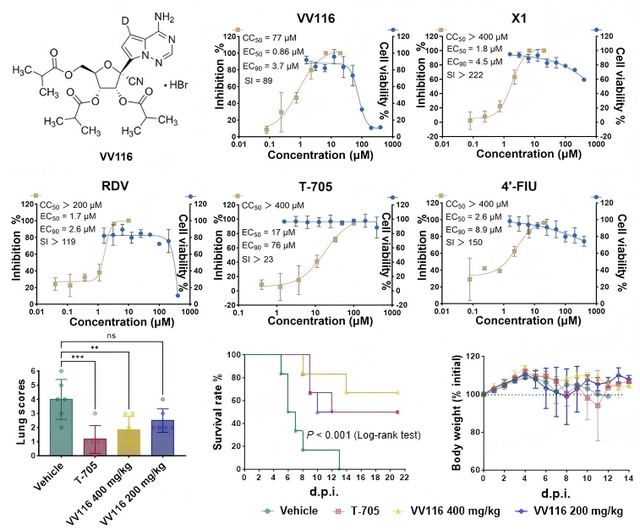 近期,中国科学院武汉病毒研究所肖庚富/张磊砢研究员团队、单超研究员团队联合上海药物研究所、旺山旺水生物医药股份有限公司胡天文博士在国际期刊EmergingMicrobes&Infections上发表了题为“TheoralnucleosidedrugVV116isapromisingcandidatefortreatingNipahvirusinfection”的重要研究成果,证实口服核苷类药物VV116对尼帕病毒具有显著的抗病毒活性,为这一高致死性新发传染病的防治带来新希望。该成果首次证实VV116对尼帕病毒的治疗潜力,不仅可作为医护人员、实验室工作者等高危人群的预防性用药,更可为应对当下和未来的尼帕病毒疫情提供一个现成的药物选择。