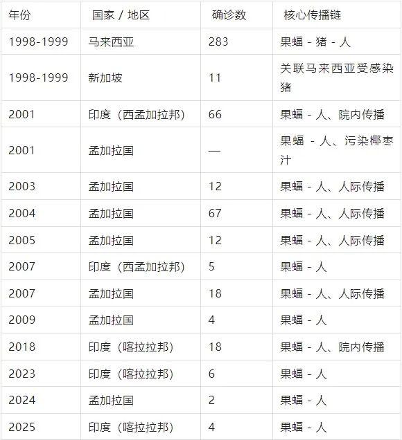 疫情焦点:尼帕病毒于1998年首次在马来西亚报告,该病多发生于每年12月至次年5月期间,近年来主要发生在印度、孟加拉国、马来西亚和菲律宾等南亚和东南亚国家。2025年5月以来仅在印度被发现,此次印度尼帕病毒病聚集性疫情规模较小,尚未发现地区病例外溢的报道。