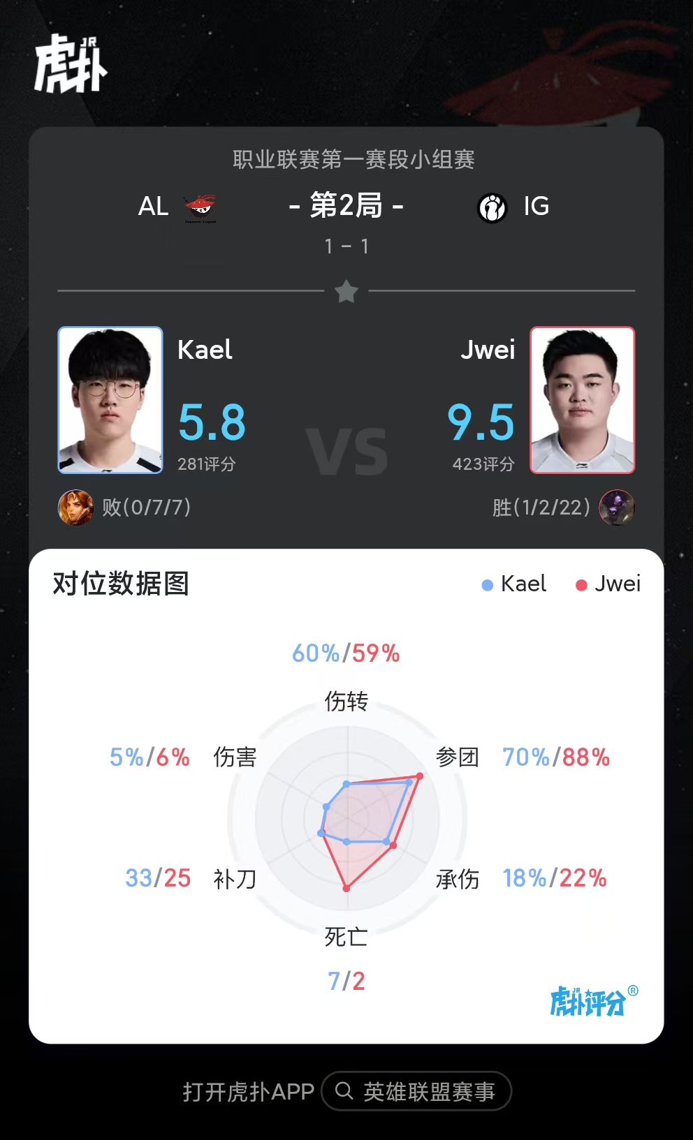 Jwei牛头打出1/2/22战绩,拿到IG对阵AL次局比赛MVP