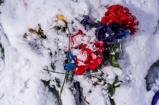 蕾妮・古德悼念点处,鲜花静卧于积雪之中。图片